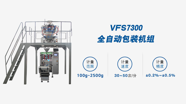 VFS7300全自動(dòng)包裝機(jī)組是由VFS7300立式充填包裝機(jī)、組合秤和輸送機(jī)組成,集稱(chēng)量、制袋、折邊、充填、封口、打印、沖孔、計(jì)數(shù)于一體,采用伺服電機(jī)同步帶拉膜,具有自動(dòng)糾偏功能。廣泛應(yīng)用于花生、茶葉、種子等顆粒物包裝。