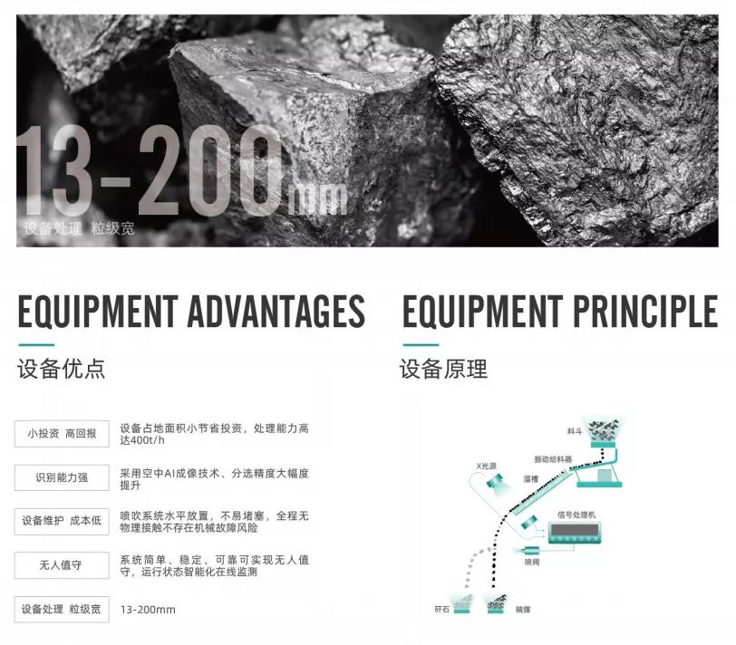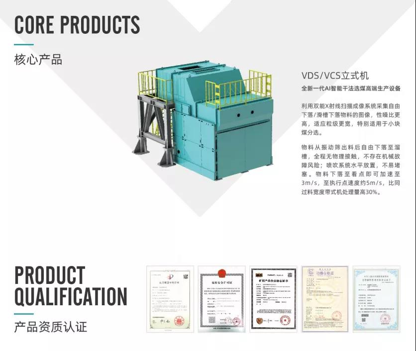 VDS/VCS立式機是全新一代AI智能干法選煤高端生產設備利用雙能X射線掃描成像系統采集自由下落/滑槽下落物料的圖像,性噪比更高,適應粒級更寬,特別適用于小塊煤分選。