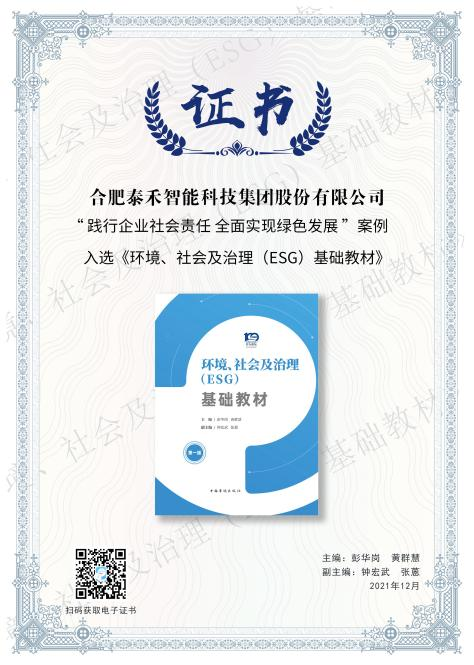 近日,由中國社會責任百人論壇主辦的“第十三屆《企業社會責任藍皮書》發布會暨ESG中國論壇2021冬季峰會”在京召開,國務院國資委、中國社科院、中國上市公司協會等領導出席本次會議。會上,我國第一本ESG教材《環境、社會及治理(ESG)基礎教材》正式發布。泰禾智能“踐行企業社會責任 全面實現綠色發展”案例入選該教材。
