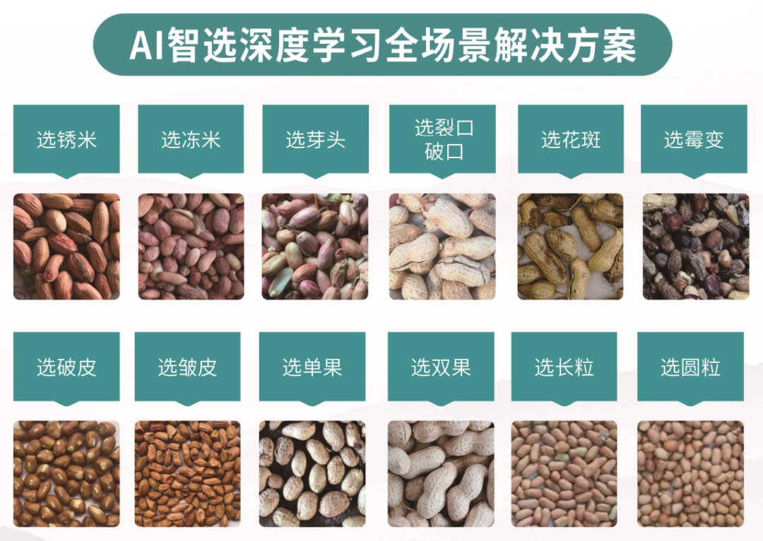泰禾AI智選深度學(xué)習(xí)色選機(jī)搭載AI深度學(xué)習(xí)系統(tǒng),產(chǎn)量大、精度高、損耗低。可有效分選花生米中的長(zhǎng)圓粒,剔除芽頭、大脫皮、小脫皮、霉變、黃銹、紫米、凍米等和其它雜質(zhì)(花生果、桿、土塊、石子等);同時(shí),可針對(duì)花生果中的裂口、破口、花斑、黑癟果、黑頭、蟲(chóng)蝕果、麻果、花生殼、單雙果進(jìn)行精準(zhǔn)高效的分級(jí)分選,實(shí)現(xiàn)優(yōu)品優(yōu)價(jià)。