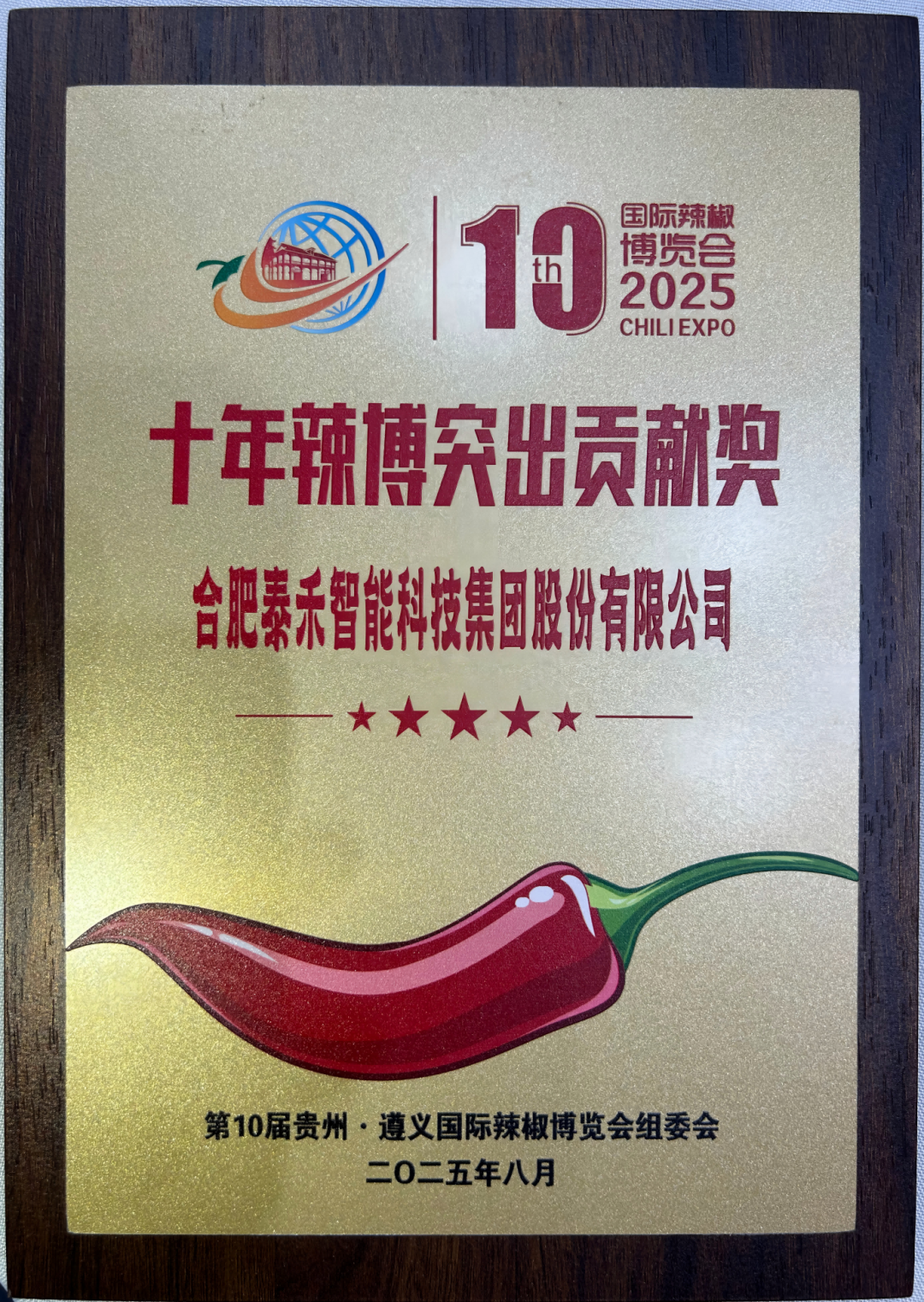 在本屆辣博會期間,泰禾智能憑借在辣椒智能分選領域持續多年的技術深耕與產業貢獻,被組委會授予“十年辣博突出貢獻獎”。