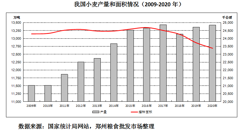 據(jù)《國(guó)家統(tǒng)計(jì)局關(guān)于2020年糧食產(chǎn)量數(shù)據(jù)的公告》,小麥播種面積23380千公頃,同比減少350千公頃;單位面積產(chǎn)量5742公斤/公頃,同比增加112公斤/公頃;總產(chǎn)量13425萬噸,同比增加66萬噸。