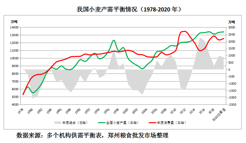 2020年,我國(guó)糧食生產(chǎn)再獲豐收,小麥繼續(xù)增產(chǎn);夏糧收購(gòu)平穩(wěn)進(jìn)行,小麥?zhǔn)召?gòu)總量同比減少,市場(chǎng)化收購(gòu)占比提升。由于需求回升以及玉米價(jià)格上漲,帶動(dòng)小麥行情震蕩攀升,臨儲(chǔ)小麥大量成交,在滿足市場(chǎng)需求的同時(shí),小麥庫(kù)存結(jié)構(gòu)也得到顯著改善。