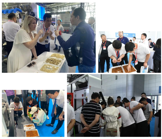 20日展會開始,泰禾智能堅果分選全場景解決方案:AI智選A系列、AI智選深度學習系列、AI智選紫外系列、AI智選X光系列盛裝亮相。全明星陣容包攬了可見光、X光、紫外線分選技術,全方位滿足行業對于各種堅果炒貨物料的復雜分選需求,令現場廠商心動不已。