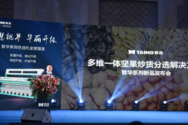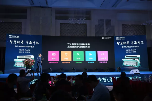 泰禾光電顏天信董事、唐麟董事及來自堅果炒貨行業的領導、嘉賓朋友們等齊聚一堂,共同見證了泰禾光電2018智華系列新品色選機的揭幕和賦能無限價值的震撼魅力。