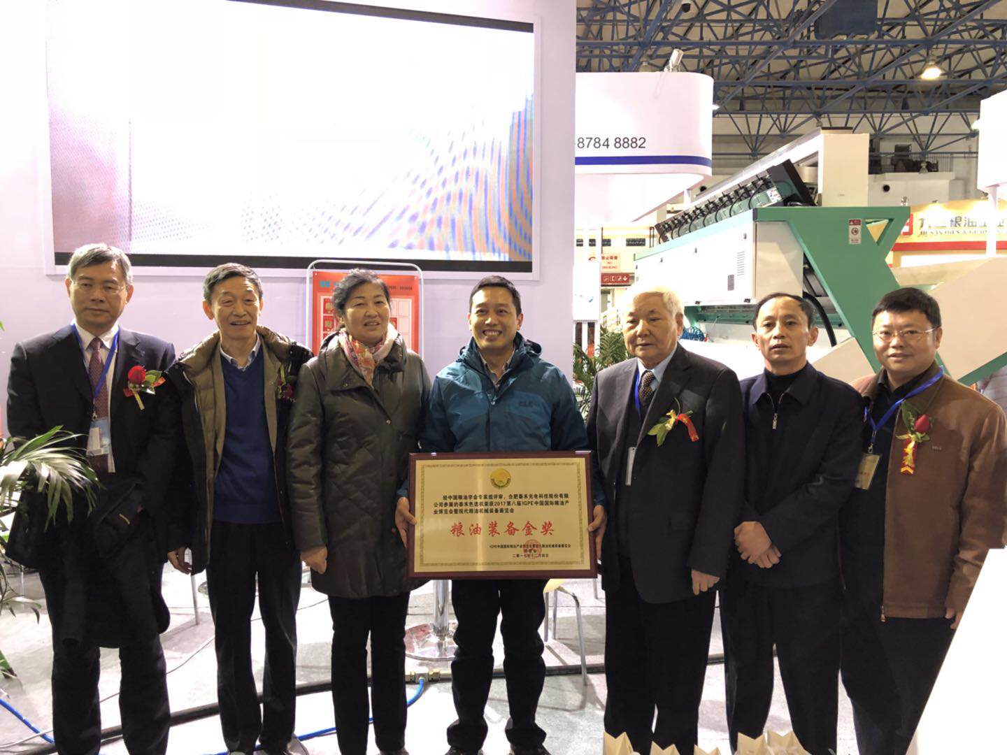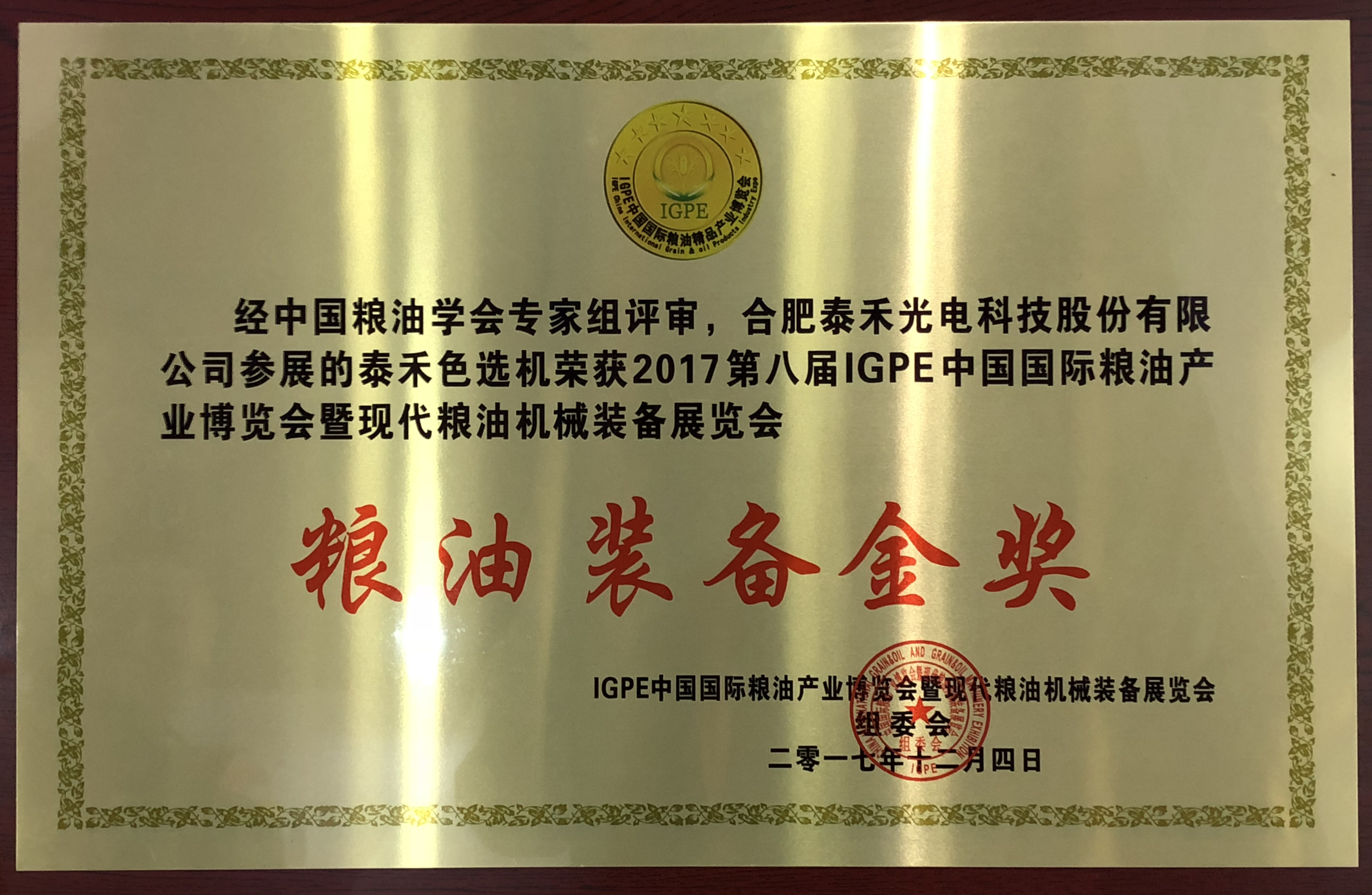 經過層層評選,“泰禾”牌智能色選機在眾多產品中脫穎而出,榮獲第八屆 IGPE 中國糧油精品展“糧油裝備金獎”。