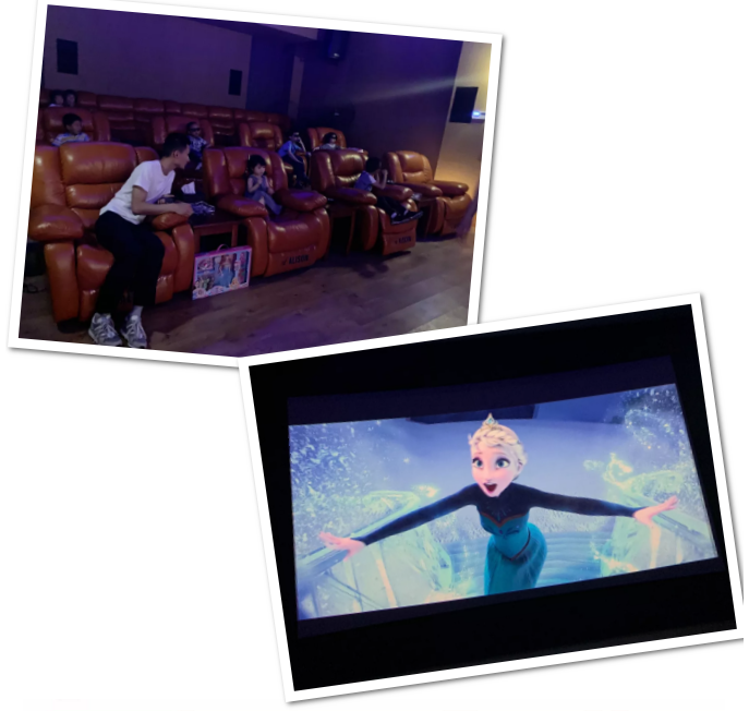 為了貼合孩子們的興趣愛好,熱鬧的游戲環節結束以后,公司放映廳播放了經典的兒童電影《冰雪奇緣》。讓兒童從活潑好動到瞬間安靜,這就是動畫片的魅力所在了!