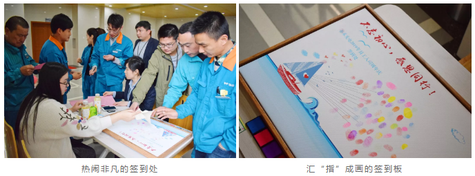 本次活動特別設置了指紋畫板簽到的環節,紅橙黃綠等多款印泥,寓意著多彩泰禾,豐富生活。數個指紋共同構成與一幅“揚帆起航”的畫卷,正迎合了所有人對泰禾未來的美好希冀,并期待與公司一同乘風破浪,駛向未來。