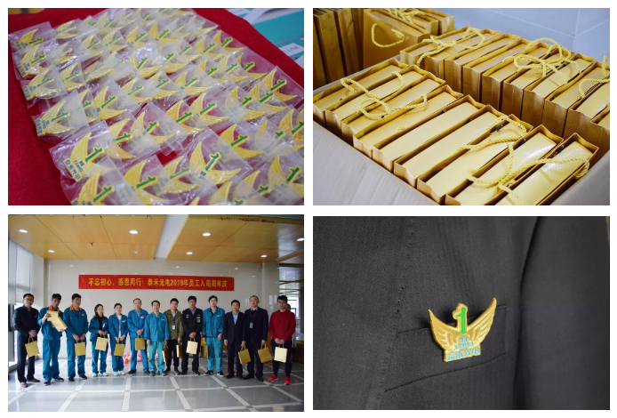 最后,全體人員都領取了公司精心準備的入司周年慶紀念禮品:入司工齡徽章與定制筆記本套裝。拿到禮品之后,大家紛紛合影留念,有同事迫不及待佩戴上工齡徽章,有的同事滿懷期待地打開筆記本套裝,臉上寫滿了自豪與欣喜。