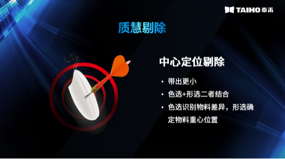 色選+形選二者結合,色選識別物料差異,辨別好壞,形選確定物料重心位置,實行中心靶向定位剔除,徹底實現帶出小,色選精度無限接近極限最小值。