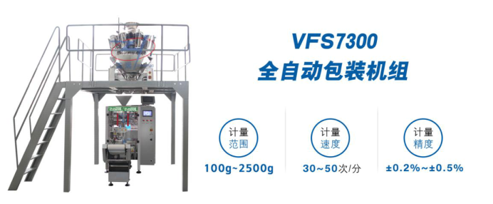 VFS7300全自動包裝機組是由VFS7300立式充填包裝機、組合秤和輸送機組成,集稱量、制袋、折邊、充填、封口、打印、沖孔、計數于一體,采用伺服電機同步帶拉膜,具有自動糾偏功能。